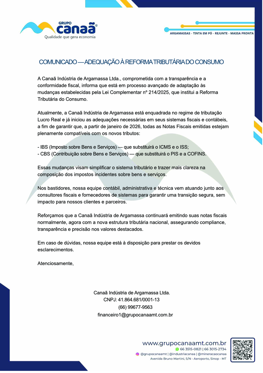Fundada em 2021 em Sinop, Mato Grosso, a Indústria Canaã se orgulha de ser mais do que uma fabricante de argamassas e produtos para construção civil. Crescemos junto com a região, atendendo à demanda local com um compromisso inabalável de qualidade, inovação e sustentabilidade.